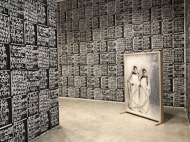 Los retratos conviven dentro de una sala de muros altos cubiertos en su totalidad por carteles con frases que a simple vista son tajantes y claros, pero que en una segunda lectura se presentan como algo ambiguo, por ejemplo, se ve “bad feminist” con connotaciones que van desde la investigación feminista anglosajona que realizó la creadora hasta el símbolo de las mujeres que se oponen a otras mujeres en la lucha, ¿entonces qué es “bad feminist”?
