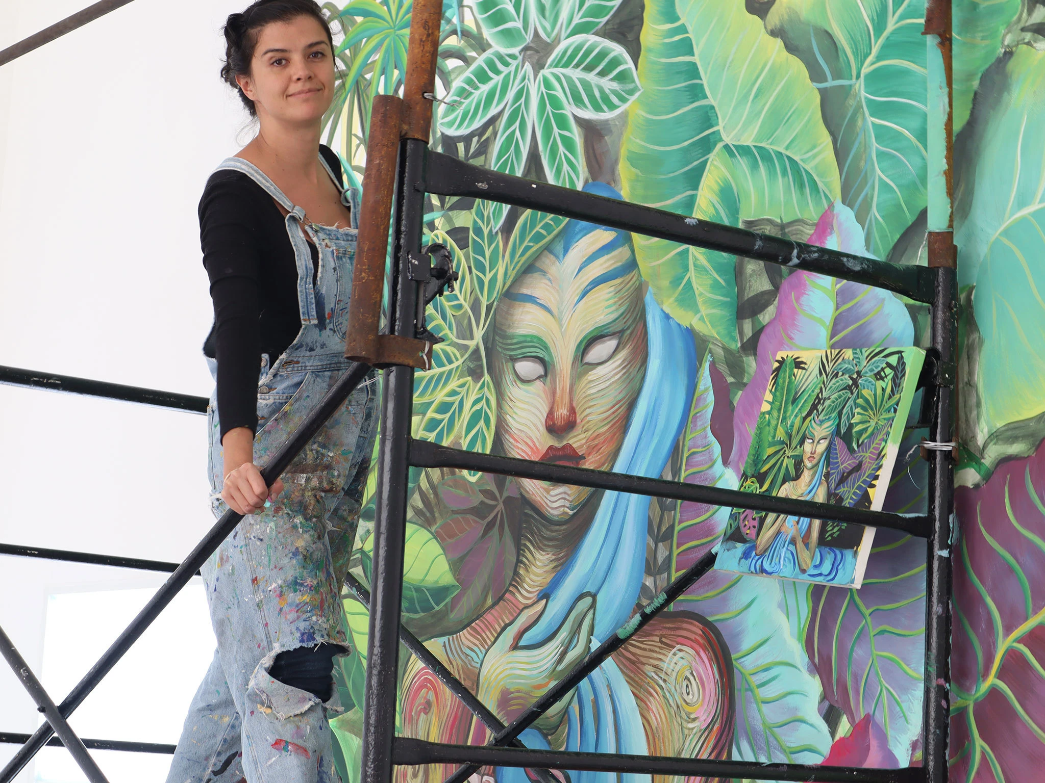 María Antonieta Canfield utiliza los arneses, los cascos y, sobre todo, la autosuficiencia y empoderamiento que le da el rápel para plasmar en gran formato mundos en los que animales y figuras humanas son rodeados o invadidos de naturaleza. “Hago una especie de naturalismo surreal monumental… Me gusta hacer murales de sueños que hablen de la naturaleza”, aclara la artista mexicana.