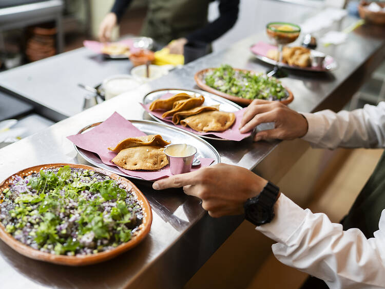 En lo que te aclimatas, ve pidiendo un cantarito o una batanga de la casa. Tres platillos que te harán la visita: el aguachile negro se sirve con dos tacos de papa y kimchi casero fritos. El chiste es usarlos de base para el camarón. Un combo inesperado pero glorioso. Luego probamos algo que fue francamente grosero –perdóname virgencita, pero no me arrepiento– bajo recomendación del equipo, las quesadillas de barbacoa (12 horas de cocción) con un poco de tuétano.