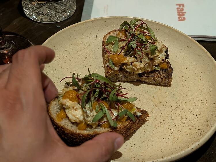 Faba funciona por su encanto: mesas discretas iluminadas con velas, una barra y cocina abiertas, de diseño brutalista e inspiración minimalista. Puedes llegar saliendo del trabajo y pedir el vino de la semana o esperar tu reserva para cenar como debe ser: cocinado al fuego.