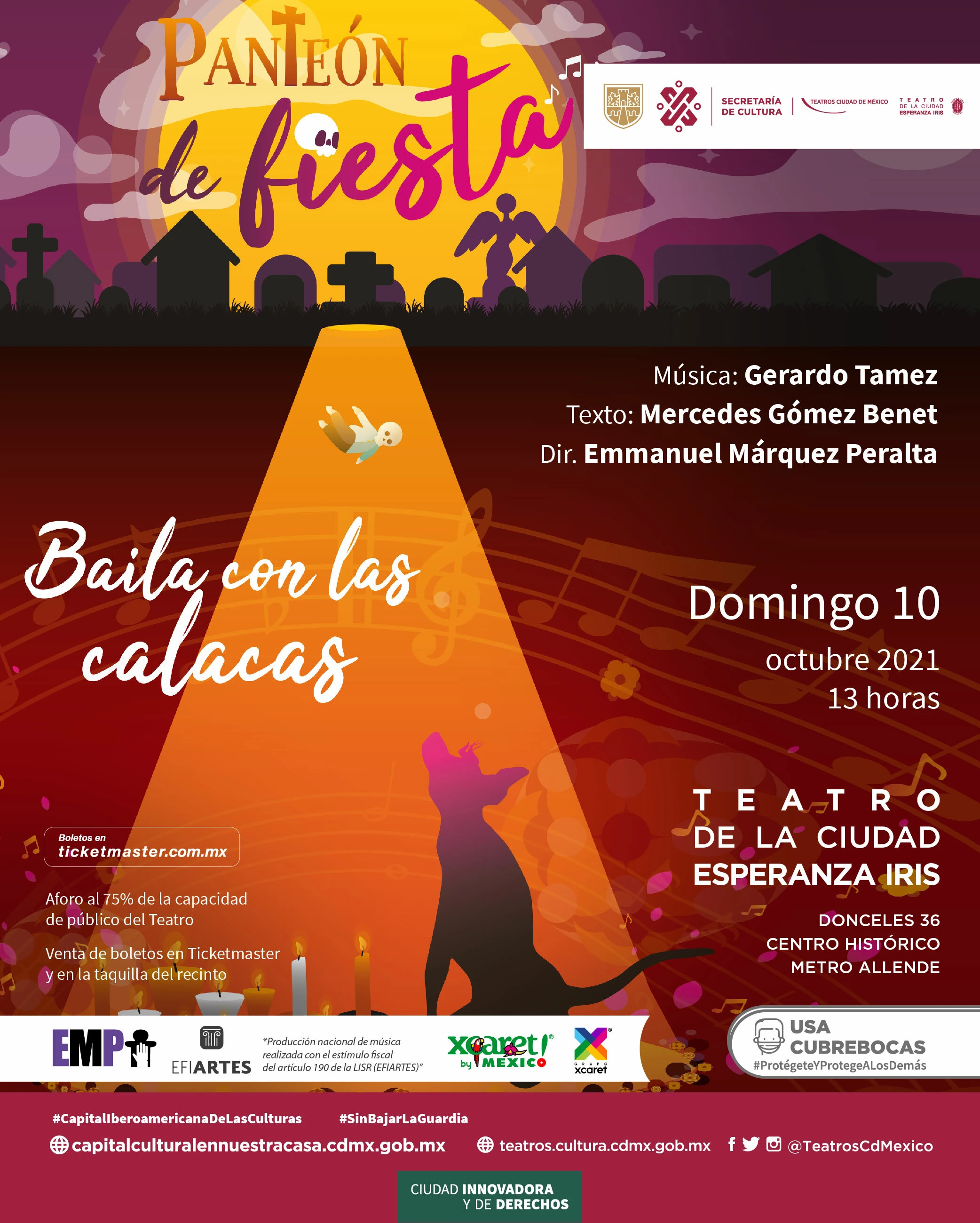 Panteón de fiesta tendrá una función única el domingo 10 de octubre a la 1pm, con cupo limitado al 75% de la capacidad del recinto y uso permanente de cubrebocas. Los boletos tienen un precio de $50 a $250 y los puedes adquirir en la taquilla del teatro y en las plataformas digitales de Ticketmaster.