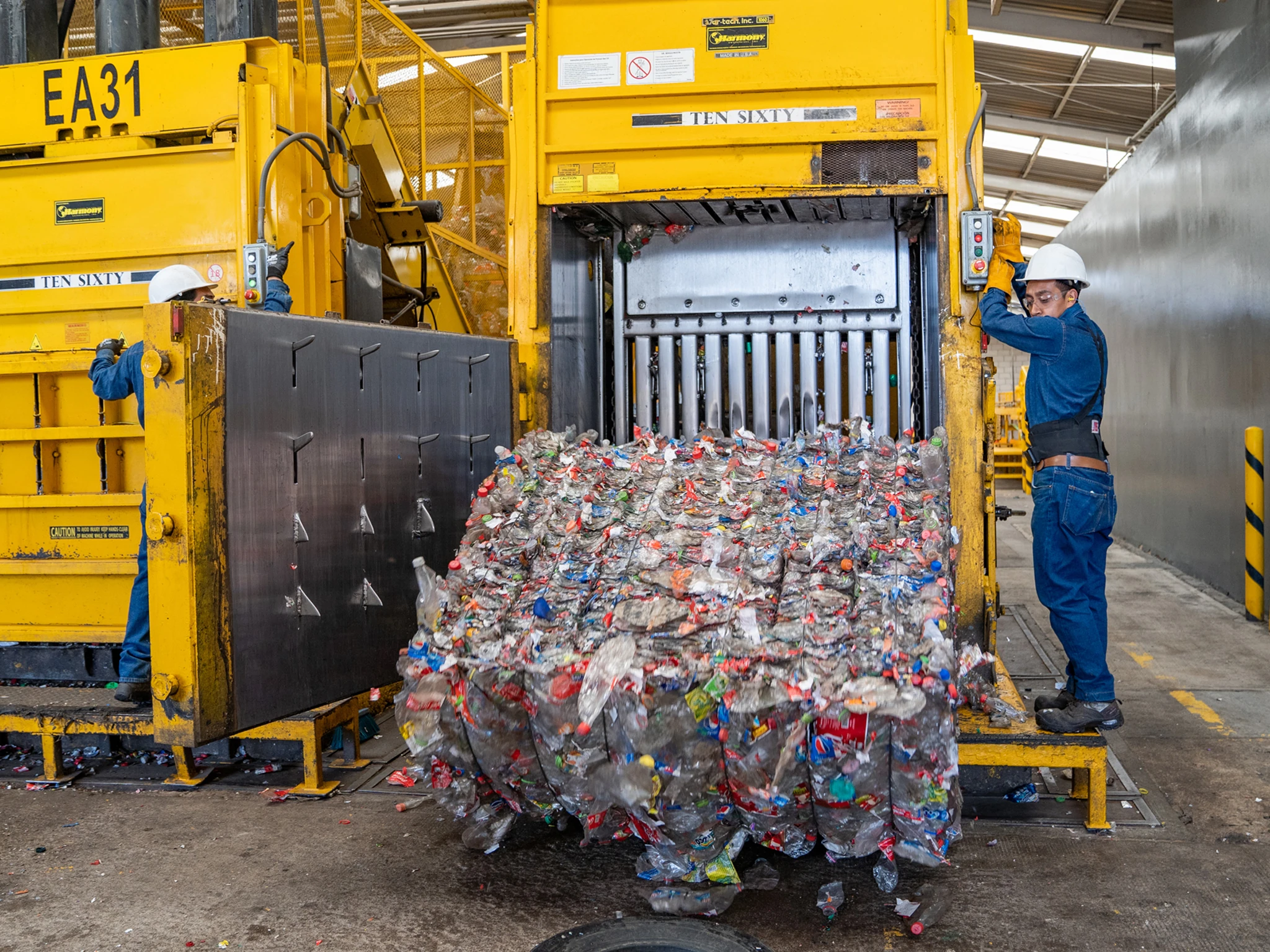 Tras esta selección inicia el prensado, donde se separan las tapas y etiquetas para otorgarles otro uso. Cada paca de botellas que se hace en estas presa pesa casi 500 kilos, se separan por colores y materiales, y momentos después el transporte de PetStar lo reparte entre sus consejeros, como Coca-Cola de México.