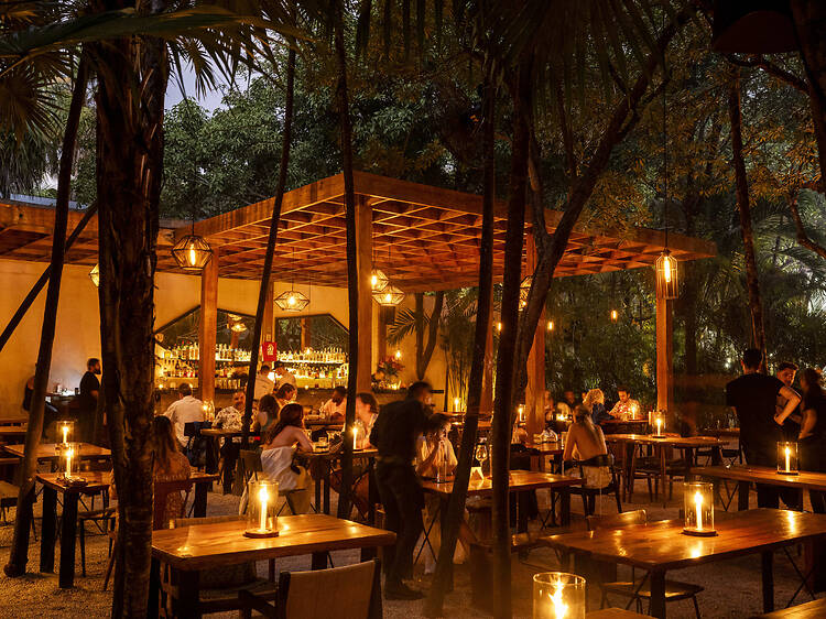 En la barra, la esencia local es la constante. El cóctel Bees and Pollen es una joya técnica que utiliza miel melipona, whisky y el emblemático licor Xtabentún, logrando una complejidad donde el dulzor y el cítrico de la naranja agria bailan con el picor del jengibre. Si buscas frescura, la Soursop Margarita —con guanábana, naranja agria y el toque inesperado del sake mexicano Nami— ofrece una textura aterciopelada que es el bálsamo perfecto para la humedad de la selva.