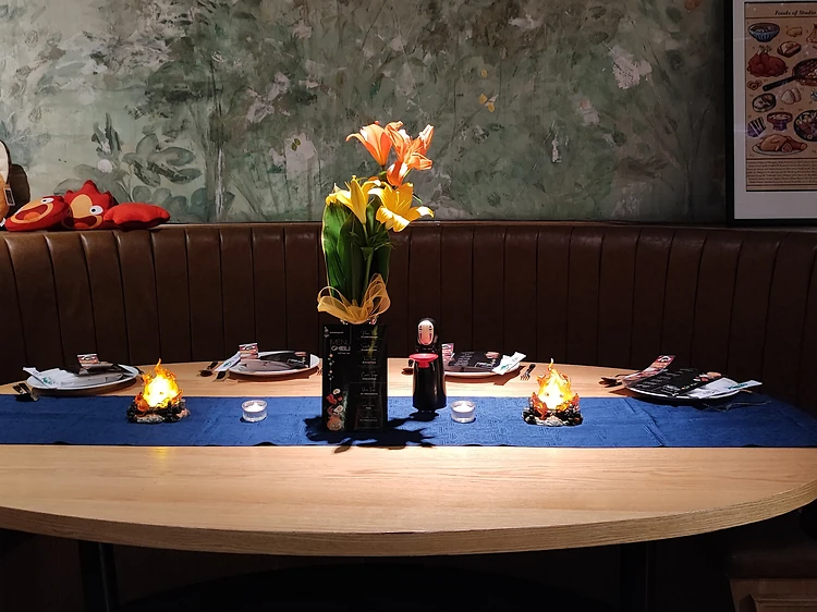 En tu mesa podrás encontrar un fantasma Sin Cara y un Calcífer luminoso que acompañarán tu velada, además una velita y un centro de flores, que podrían omitirse para dejar mayor espacio, pero le dan un toque romántico.