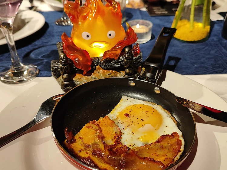 Luego, el primer tiempo inspirado en El Increíble Castillo Vagabundo, será un huevo estrellado con tocino marinado en achiote que es lo que le da el toque de sabor; el segundo plato es sacado de El Castillo en el cielo, es un estofado de res con verduras (más cebolla y col) y adobo, tiene un toque muy casero.
