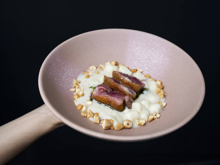 El plato: nuestro favorito indiscutible fueron los gnocchi con láminas de pato y cremoso de gorgonzola son celestiales. Tersos, esponjosos, con la untuosidad justa y el toque herbal del pesto y kōsho de lima yucateca.
