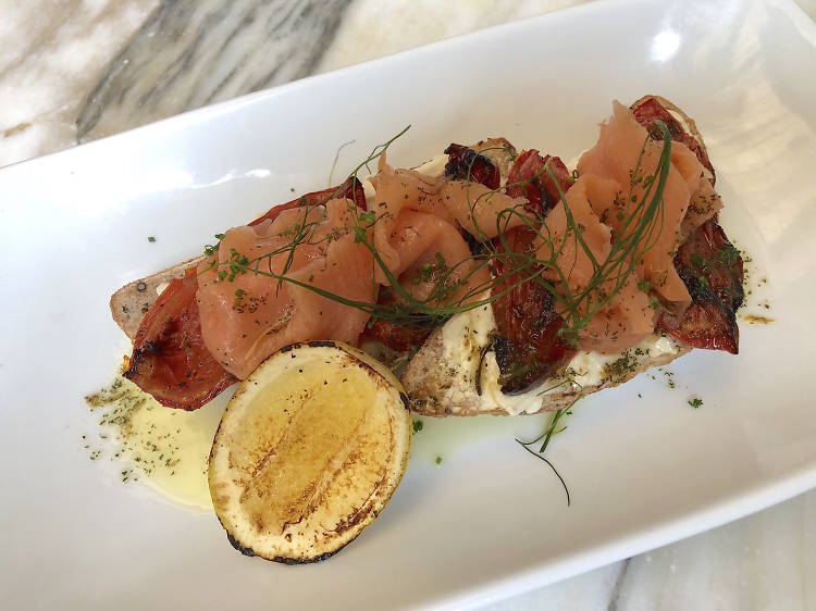 Otra de las especialidades es el french dip de rib eye, una crujiente chapata artesanal con carne gratinada en queso gouda, aderezada con rábano picante y acompañada de papas fritas con aceite de trufa. Las mejores opciones con sabores mexicanos son el burrito de huevo con machaca y los tacos de langosta, al estilo Baja California con frijoles, pero con un toque de panceta, tuétano y arroz con azafrán para darle un empujón al sabor. Para el postre están los blackberry pancakes, suavecitos y con crema batida y maple.