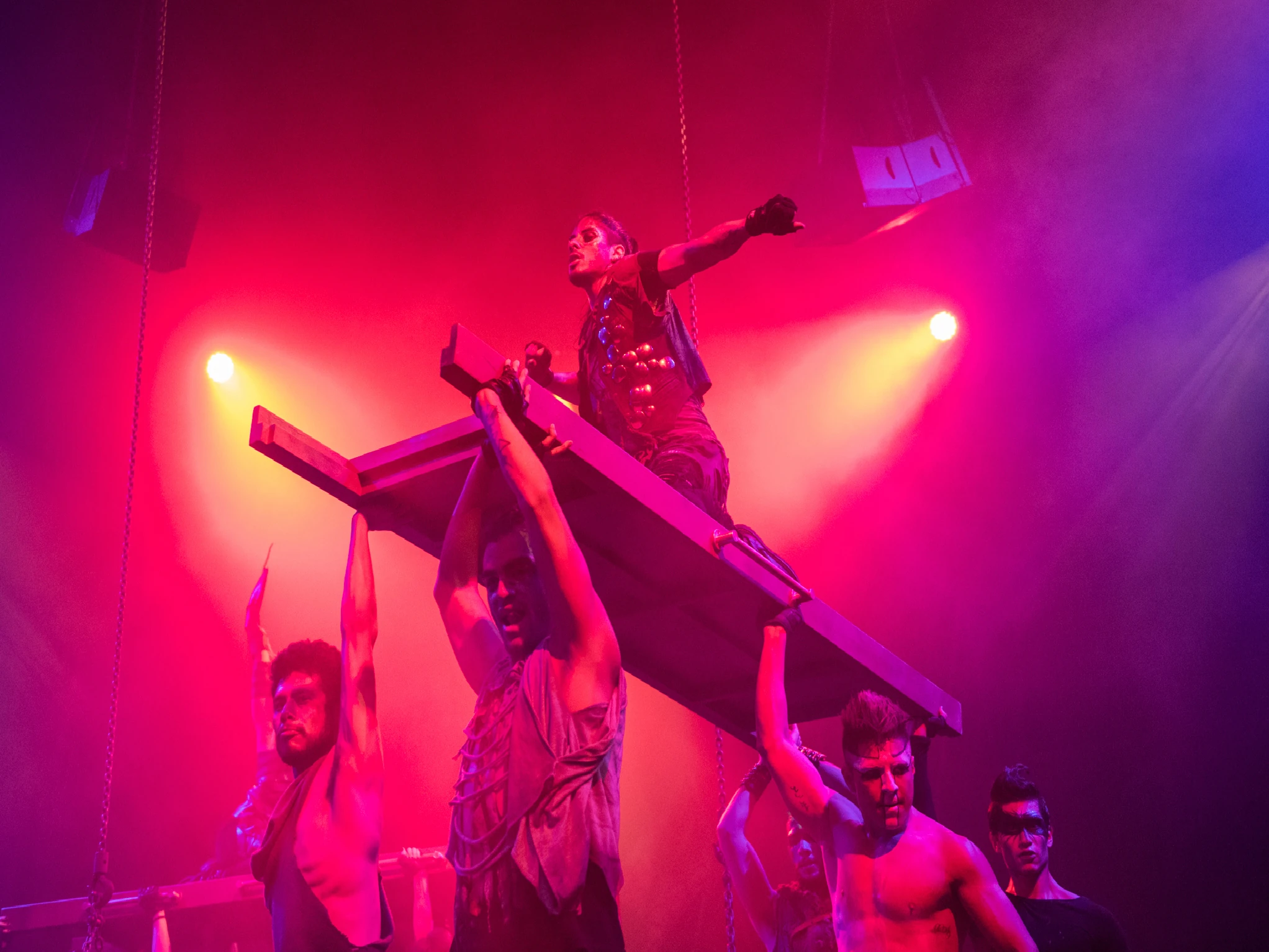 Nueve cantantes, seis músicos y 20 bailarines con atuendos raídos, maquillajes extravagantes y andares salvajes —como si fuesen los sobrevivientes de un Apocalipsis— literalmente caen del cielo para demostrar que el rock perdurará mucho más allá del fin de los tiempos. Así que no te asustes si de repente volteas y está junto a ti uno de estos seres (si estás desprevenido hasta podrían intentar unirte a su séquito).